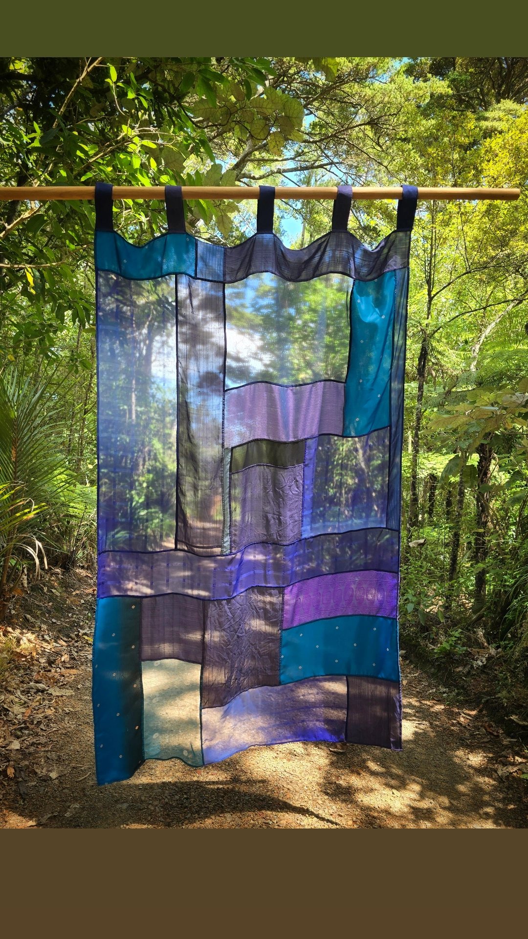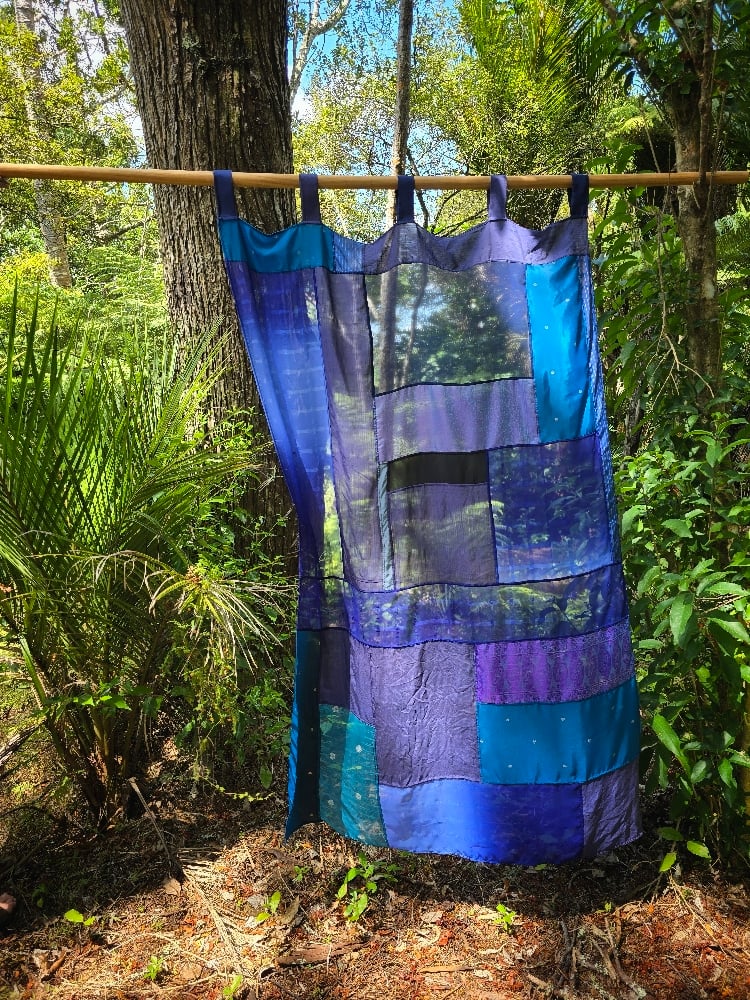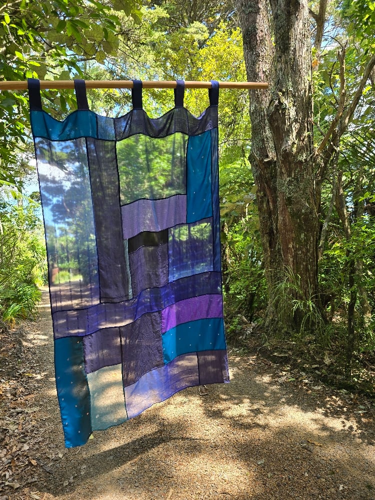 As the textiles are recycled it isnt always possible to know the exact composition. This curtain is predominately made from synthetic sari textiles, which are often the hardest to recycle meaningfully.
